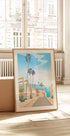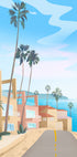 Una ilustración costera brillante y colorida con palmeras, casas junto al mar y el mar resplandeciente. Esta obra de arte captura el ambiente relajado del verano de California, perfecta para la decoración de paredes inspirada en la playa y los viajes.