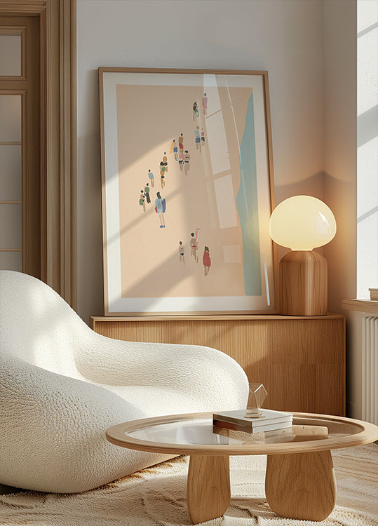 Una ilustración sencilla y apacible de bañistas dirigiéndose al mar, pintada en suaves tonos pastel. Perfecta para crear un ambiente luminoso y relajado en casas de verano o de playa.