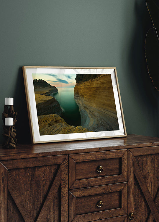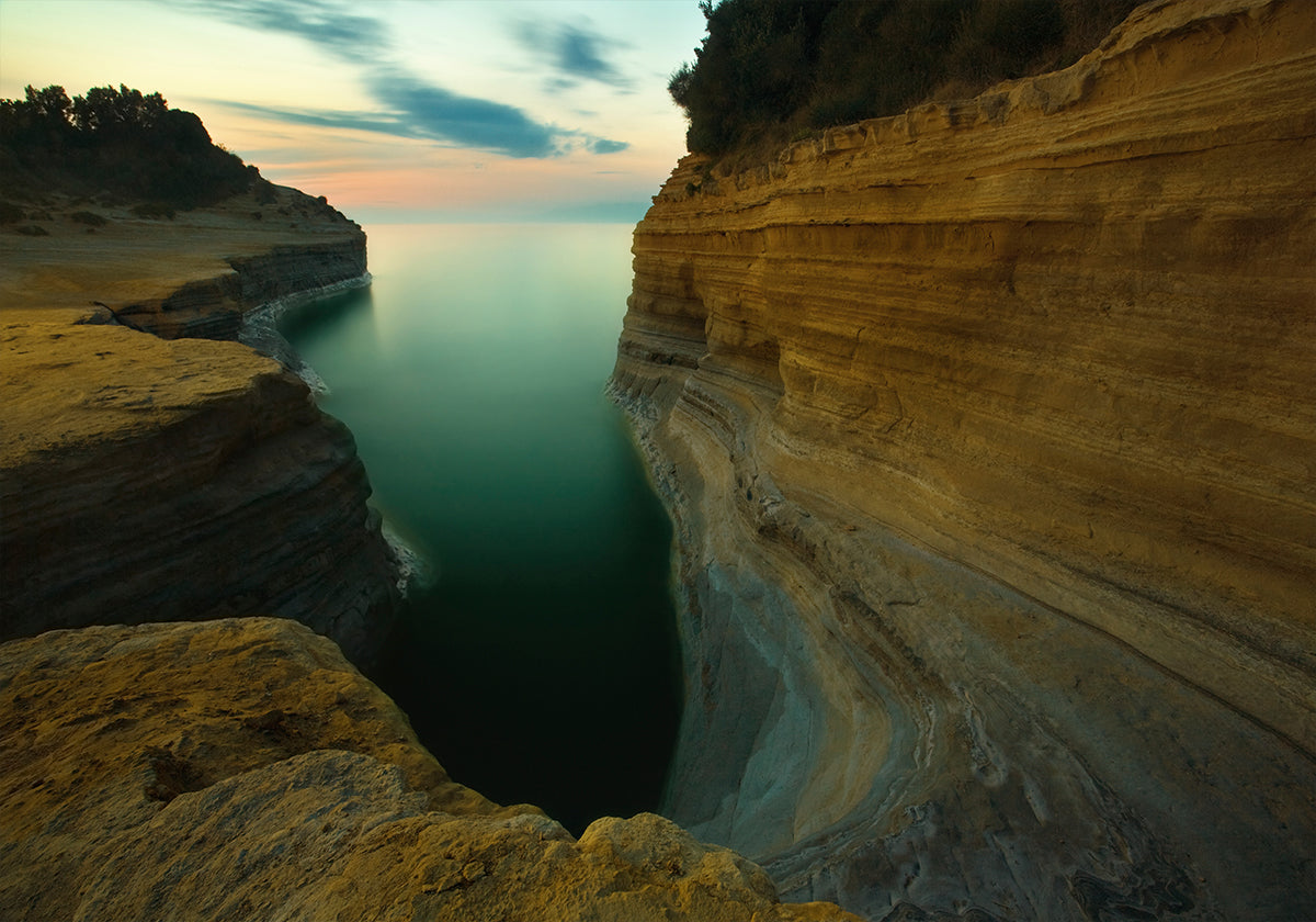 Una serena toma de larga exposición del icónico Canal d'Amour en Corfú, Grecia. Las aguas color esmeralda están enmarcadas por espectaculares acantilados de arenisca, creando una atmósfera misteriosa y romántica. Este paisaje costero captura la belleza natural, la tranquilidad eterna y el encanto legendario del Mar Jónico.