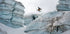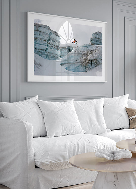 Una impresionante toma de acción del esquiador de estilo libre Candide Thovex volando por el aire entre enormes glaciares de hielo. Tomada en Chamonix, Francia, esta imagen captura la adrenalina, la habilidad y el espíritu intrépido de los deportes de invierno. El paisaje helado y el salto que desafía la gravedad lo convierten en un tributo icónico a la aventura y al esquí extremo.