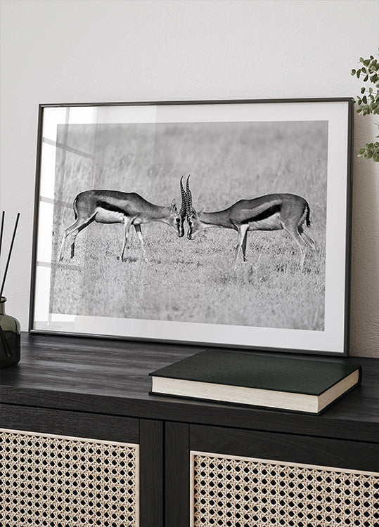 Una poderosa fotografía animal en blanco y negro de dos gacelas enfrentándose en un duelo, con sus cuernos chocando con fuerza y desafío. Captada en la vasta sabana del Serengeti, esta imagen transmite energía pura, supervivencia y el espíritu atemporal de la naturaleza.