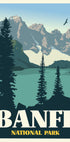 Un motivo de viaje atemporal del Parque Nacional Banff: aguas turquesas de montaña como espejos enmarcadas por pinos de color verde oscuro, con picos nevados que se elevan en el horizonte. El aire limpio del invierno, la nieve tranquila y los reflejos nítidos invitan a la aventura. La tipografía elegante completa el ambiente icónico. Un pájaro solitario se cierne sobre el lago.