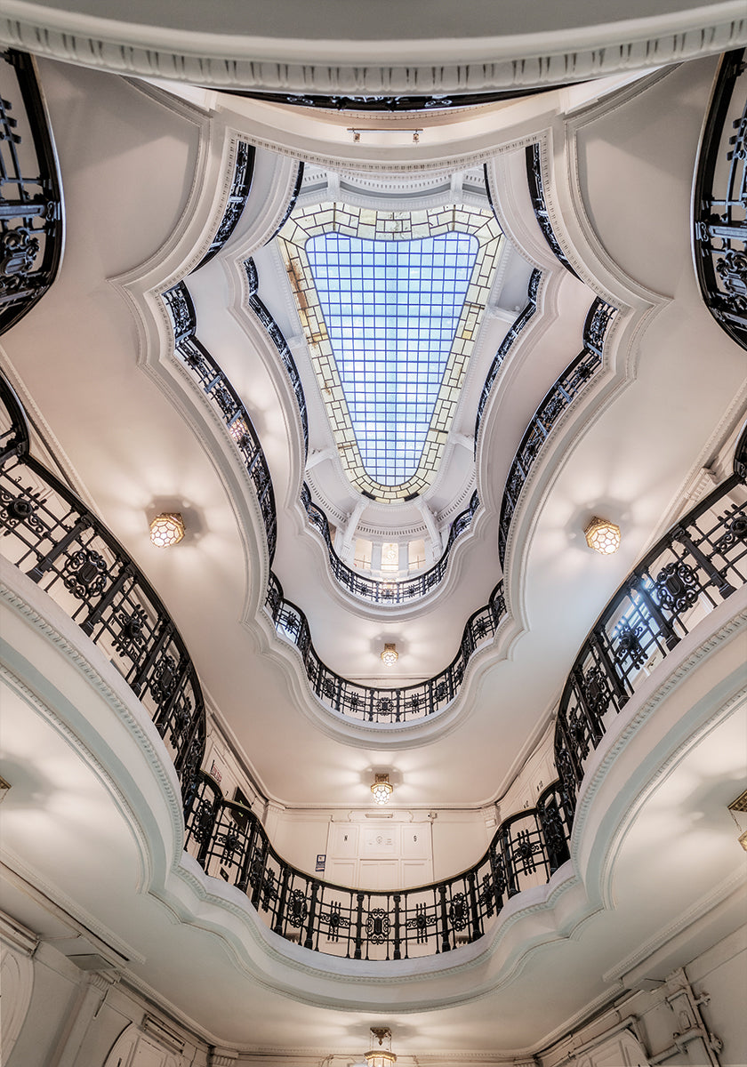 Una mirada hipnótica a través de la icónica escalera de la Casa Palazuelo en Madrid, capturada por el fotógrafo Jorge Ruiz Dueso. Las líneas curvas y los pisos repetidos forman un patrón gráfico donde danzan luces y sombras. Un homenaje urbano a la poesía de la arquitectura que levanta cualquier muro. La perspectiva lleva la mirada hacia arriba, a través de formas y profundidad, y da paz a la habitación.