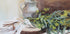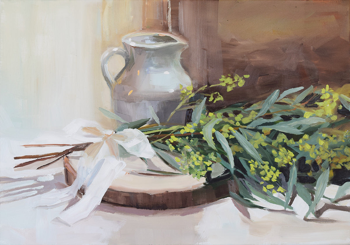 Un encantador bodegón de una jarra rústica con delicado follaje y flores amarillas dispuestas a su lado. La obra de arte captura una atmósfera cálida y atemporal con sus pinceladas pictóricas, tonos apagados y contrastes suaves. Perfecto para crear un ambiente acogedor de inspiración vintage.