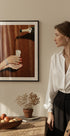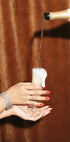 Una glamorosa fotografía de naturaleza muerta que muestra cómo se vierte champán en una copa. Las elegantes joyas, las uñas rojas y los detalles festivos crean una sensación de celebración, lujo y alegría, perfectas para el arte mural inspirado en una fiesta.
