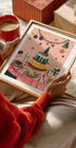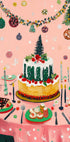 Este colorido motivo navideño muestra una festiva mesa de ducados con un gran e imaginativo pastel en el centro. El pastel está decorado con frutos verdes, blancos y rojos y un pequeño árbol de Navidad encima. Alrededor de la mesa hay platos llenos de delicias variadas, velas de varios colores y pequeños detalles que contribuyen a crear un ambiente cálido y divertido. El fondo es rosa y está decorado con bolas, guirnaldas y estrellas colgantes, lo que crea una atmósfera animada y alegre que captura la magia de la Navidad.