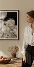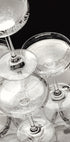 Una sofisticada fotografía en blanco y negro de una torre de champán, con finos reflejos y burbujas en una copa cupé vintage. Esta naturaleza muerta atemporal captura la elegancia de la fiesta y es una hermosa adición a cocinas, comedores e interiores elegantes modernos.
