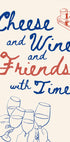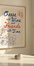 Un encantador póster tipográfico con el texto "Queso y vino y amigos del tiempo", ilustrado con una copa de vino levantada para brindar y un plato de queso en estilo boceto. Perfecto para cocinas, comedores y amantes del vino, este divertido diseño celebra la amistad, la comida y los buenos momentos.