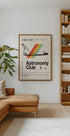 Un póster de inspiración retro del transbordador espacial Discovery de la NASA con un distintivo diseño de rayas de arcoíris que atraviesa la nave espacial. La combinación de minimalismo, tipografía vintage y texto japonés hace de esta obra de arte una mezcla de astronomía, diseño y nostalgia. Un sorprendente tributo a la exploración espacial y la innovación estadounidense.