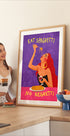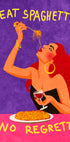 Una ilustración audaz y divertida de una mujer glamorosa que disfruta de espaguetis y vino tinto con la divertida frase "Eat Spaghetti, No Regretti". La obra de arte combina humor, feminidad y estilo, y es perfecta como declaración de intenciones en la cocina, el comedor o como decoración de pared moderna.