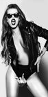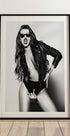 Un retrato atrevido y atrevido en blanco y negro de una mujer con una chaqueta de cuero y gafas de sol que irradia confianza y actitud. Combinando sensualidad, rebelión y glamour, esta sorprendente obra de arte inspirada en la moda es perfecta para interiores modernos, áreas de moda o como declaración de arte mural contemporáneo.