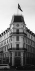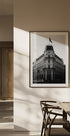 Una majestuosa fotografía en blanco y negro de un edificio histórico de Copenhague, coronado con un campanario y una elegante bandera. Reflejando el encanto europeo atemporal, la fachada detallada y la gran simetría hacen de este grabado una sofisticada pieza de arte mural para interiores inspirados en la arquitectura, la cultura y la vida urbana clásica.