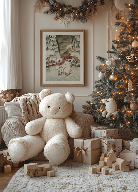 Creado por Olena Kovalova: Creatures of the North une a un amigable oso y un curioso conejo en una tierra nevada del norte. Los tonos apagados de rojo, verde y verde azulado y un toque vintage crean una cálida atmósfera navideña, mientras que los tranquilos detalles invitan a la presencia y la comodidad en los tranquilos días de invierno. Perfecto para los rincones acogedores de la Navidad.