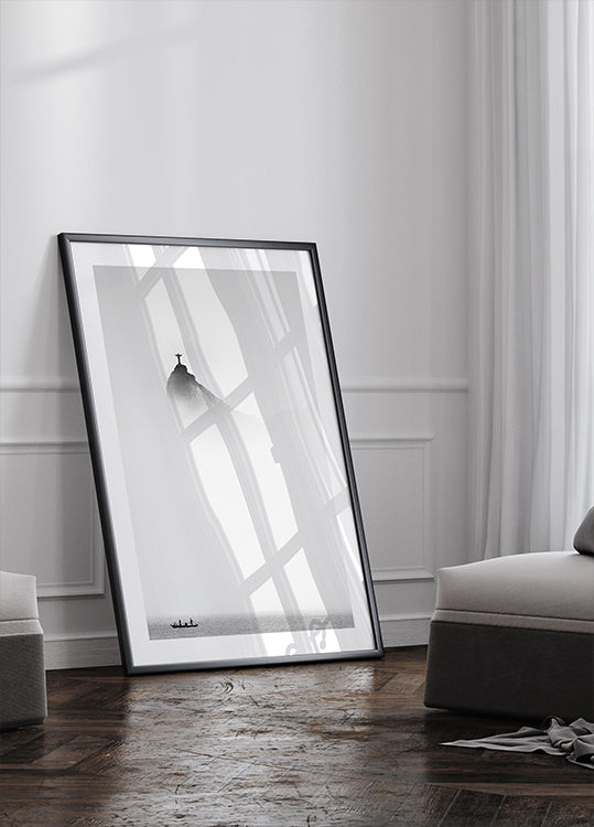 Una serena fotografía en blanco y negro que captura la icónica estatua del Cristo Redentor en Río de Janeiro, erguida majestuosamente sobre la niebla. La atmósfera brumosa crea una atmósfera espiritual y contemplativa, mientras que un pequeño bote de remos en el agua enfatiza la escala y la profundidad de la escena. Una obra atemporal que combina monumentalidad con serenidad, perfecta para los amantes de la fotografía religiosa, arquitectónica y minimalista.