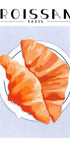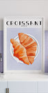 Una encantadora ilustración gastronómica que celebra el croissant francés, servido en un plato en cálidos tonos dorados. Con el texto "Croissant Paris" escrito en una tipografía elegante, esta obra de arte captura el espíritu de los cafés franceses y la cultura del desayuno. Un bonito estampado para cocinas, comedores o cualquier persona que ame el estilo parisino y los productos horneados.