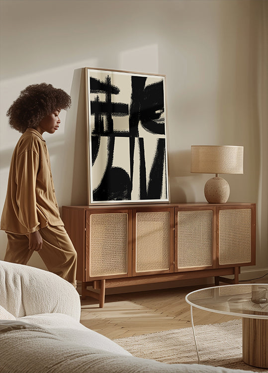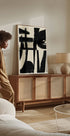 Una sorprendente obra de arte abstracta monocromática con fuertes pinceladas negras sobre un fondo neutro. Las líneas texturizadas y las formas expresivas crean un equilibrio dinámico entre movimiento y quietud, lo que lo convierte en una declaración moderna en la decoración contemporánea.