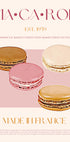 Póster de macarrones franceses con coloridos pasteles a base de merengue, que resaltan sus orígenes y su establecimiento en 1959. El diseño destaca los productos horneados tradicionales, los colores vibrantes y el arte de la pastelería francesa.