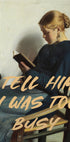Combinando realismo clásico con texto moderno, esta obra de arte representa a una mujer leyendo la frase "DILE QUE ESTABA DEMASIADO OCUPADA" en letras negritas. La obra explora temas de introspección e independencia, equilibrando la elegancia atemporal con una expresión audaz y moderna.