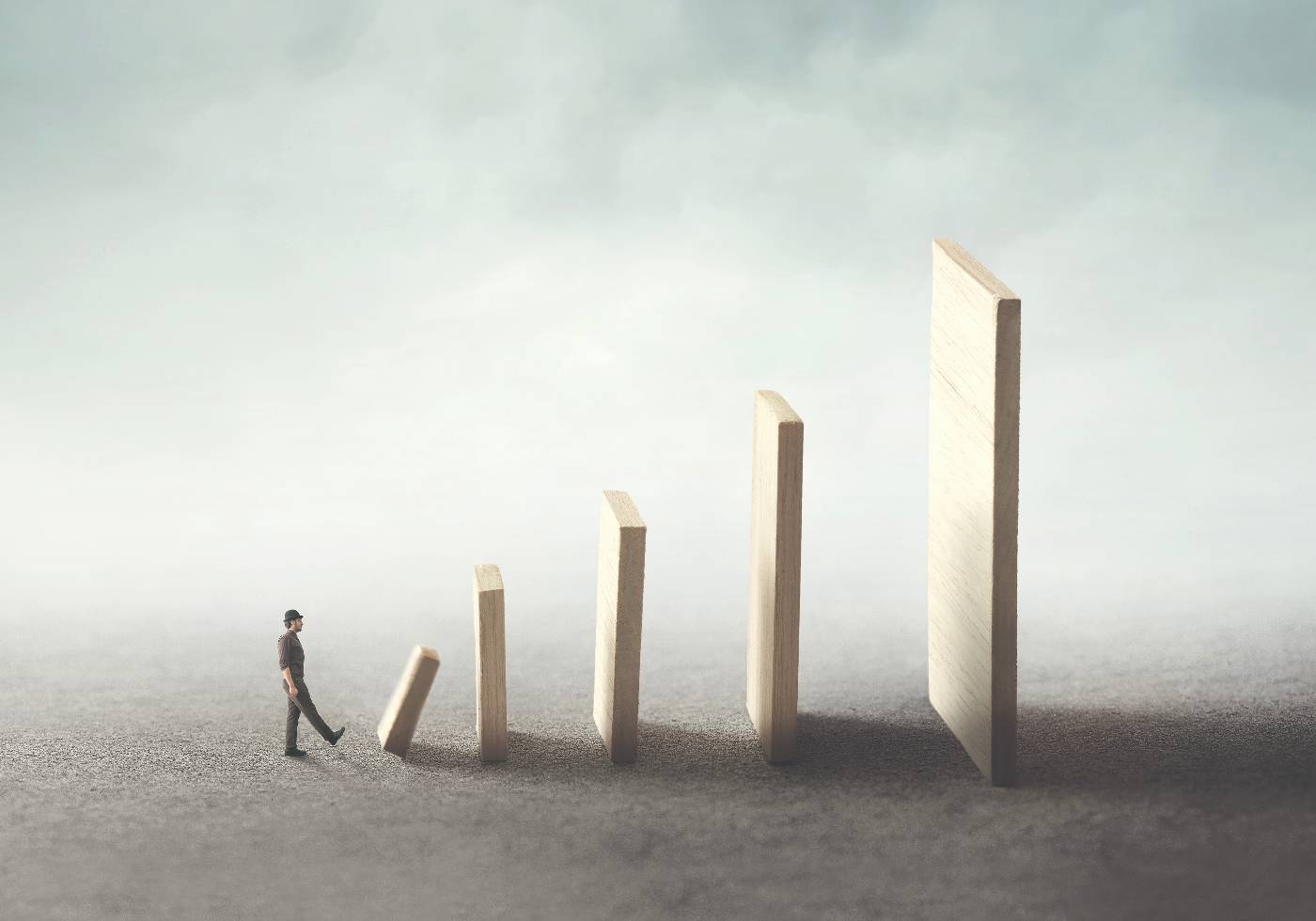 Una metáfora visual surrealista: un hombre pequeño empujando la primera de muchas fichas de dominó. Una imagen impactante de cómo pequeñas acciones pueden tener grandes consecuencias, ideal para espacios reflexivos o motivadores.