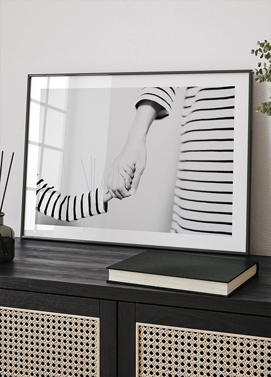 Este conmovedor póster en blanco y negro captura la belleza de la conexión y la confianza. Un tierno momento entre dos manos, enmarcado por ropa a rayas, simboliza el amor, la familia y la comunidad. Minimalista pero profundamente emocional, una pieza atemporal que encaja perfectamente en hogares modernos y clásicos.