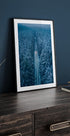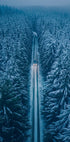 Un solitario camino invernal atraviesa un oscuro bosque de pinos, envuelto en niebla y un brillo azulado. A lo lejos, los faros de los coches rompen el silencio y dirigen la mirada hacia el horizonte, donde se encuentran la nieve y la niebla. La estrecha simetría y la calma melancólica capturan el anhelo del viaje. Fotografía de Oskar Ulvur. Perfecto para los amantes de los tranquilos paisajes invernales.