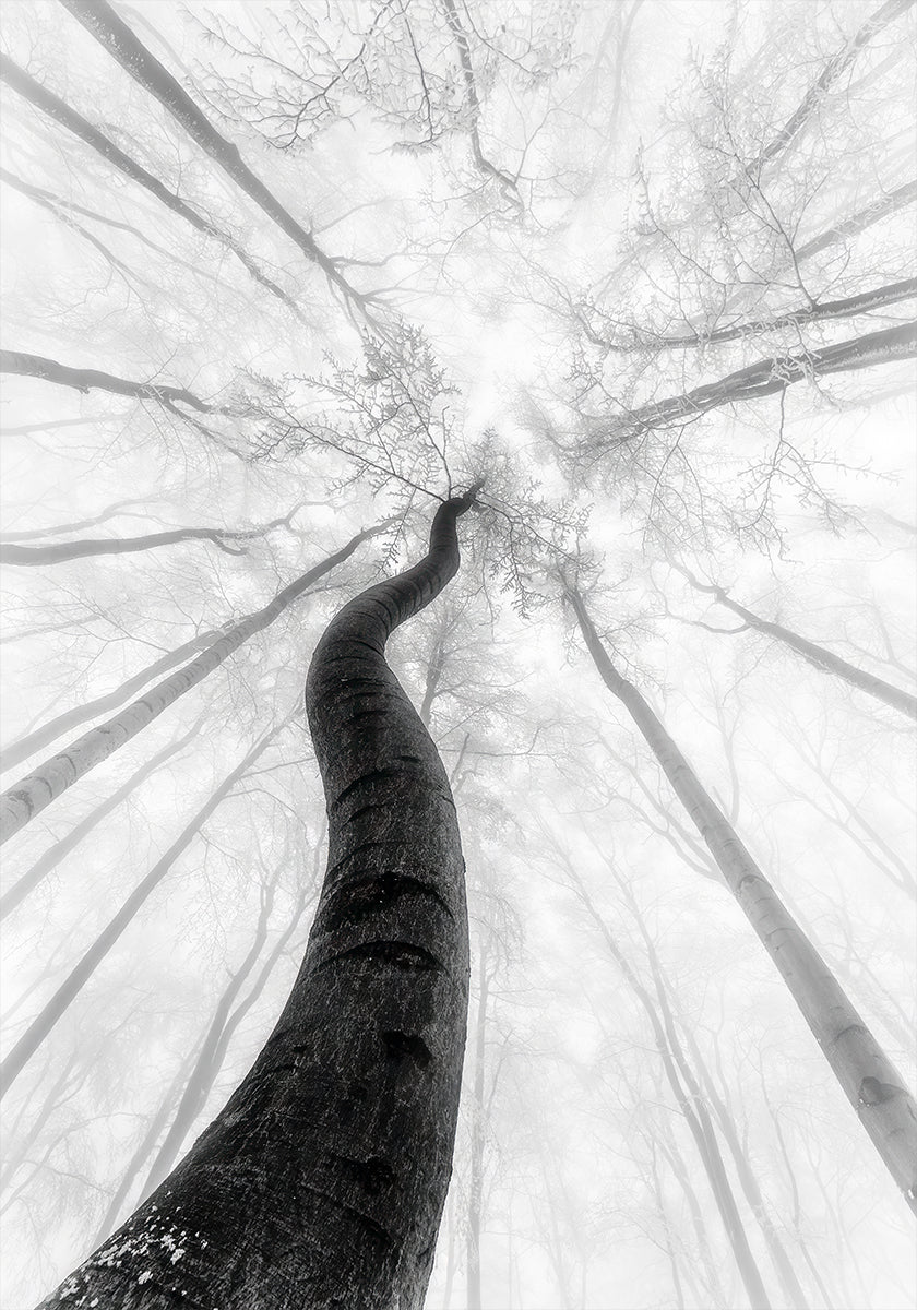 Un tranquilo momento invernal capturado por el fotógrafo Tom Pavlasek: esbeltas hayas se alzan en la nieve, envueltas en niebla y escarcha. Los suaves tonos grises y blancos crean profundidad y calma, mientras que las líneas repetidas dibujan líneas gráficas en el paisaje. Un ambiente minimalista y nórdico para el hogar. Perfecto para estancias que buscan claridad, silencio y naturaleza.