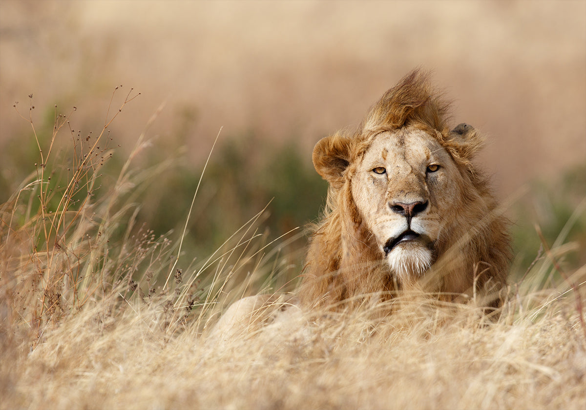 Imponente y sereno, un león macho se encuentra sobre la hierba de la sabana azotada por el viento, su melena ondeando como una llama mientras un suave bokeh derrite el Serengeti hasta convertirlo en oro. Cada bigote y cada mirada ambarina declaran la silenciosa autoridad de lo salvaje. Capturado en Tanzania por el fotógrafo Ali Khataw, este retrato corona cualquier espacio con una majestuosidad indómita.