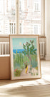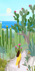Una colorida ilustración de un jardín mediterráneo con exuberantes cactus, suculentas y plantas exóticas con vistas al mar. Una mujer con un vestido amarillo camina por el camino de piedra, evocando una sensación de exploración, tranquilidad y belleza natural. Perfecto para llevar vibraciones veraniegas y encanto botánico a cualquier habitación.