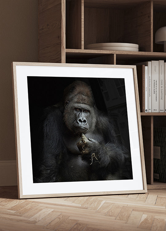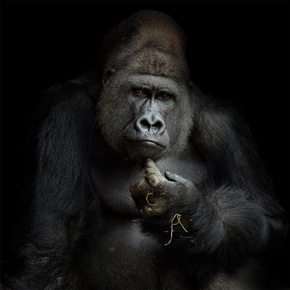Un retrato dramático y discreto de un lomo plateado, envuelto en una profunda sombra sobre un fondo negro. La mirada es intensa y pensativa, como una conversación silenciosa sobre fuerza, vulnerabilidad y sabiduría. Antje Wenner-Braun captura el momento mágico en el que el rostro del primate se convierte en poesía pura y moderna. Un tributo a la dignidad y el poder silencioso del gorila.