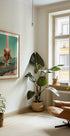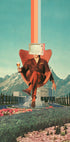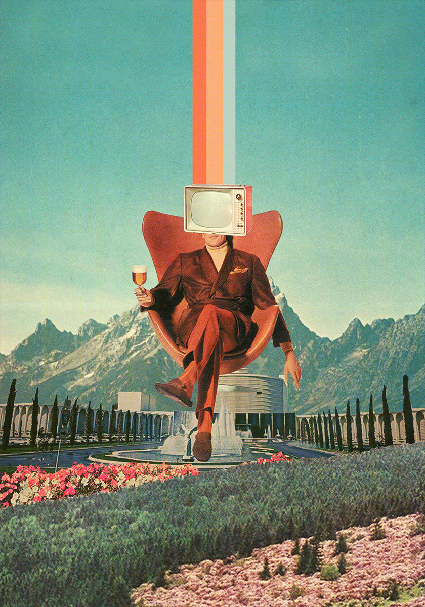 Un collage digital surrealista de un hombre con atuendo retro sentado con confianza en un sillón naranja con una copa de vino en la mano. Su cabeza es reemplazada por un viejo televisor que proyecta rayas de colores hacia el cielo. La escena combina arquitectura futurista, paisajes montañosos y detalles florales, creando una mezcla distintiva de nostalgia retro y fantasía surrealista.