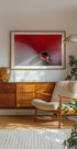 Una obra de arte macro abstracta llamativa con una delicada gota de agua sobre suaves tonos rojos y neutros. El primer plano crea una sensación de intimidad y elegancia, lo que lo convierte en una pieza perfecta para interiores modernos.