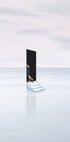 Una obra de arte conceptual surrealista que representa a una persona cruzando una puerta oscura sobre aguas tranquilas y reflectantes. La disposición minimalista, con una escalera que conduce a la nada, evoca temas como el escape, la partida y los nuevos comienzos. La escena mezcla el surrealismo onírico con una estética inspirada en mediados de siglo.