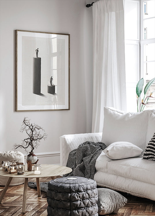 Una obra surrealista que invita a la reflexión y que representa dos pequeñas figuras humanas de pie sobre pedestales cilíndricos separados a diferentes alturas. Una figura mira hacia abajo desde una plataforma más alta, mientras que la otra mira hacia arriba, ilustrando temas de desigualdad, privilegio y jerarquía social. El diseño minimalista en escala de grises realza la expresión simbólica de la obra y la convierte en un poderoso comentario visual sobre el estatus, la ambición y la perspectiva. Perfecta para colecciones de arte moderno, conceptual y minimalista.