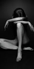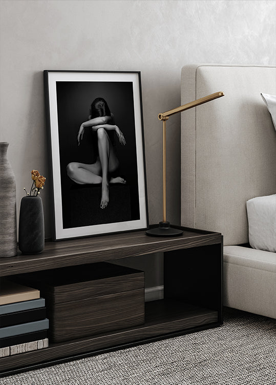 Una potente fotografía artística en blanco y negro de una mujer sentada que expresa emociones crudas, sensualidad y vulnerabilidad. Con una iluminación espectacular y una expresión monocromática, la obra evoca temas de tristeza, fuerza y melancolía, y se convierte en una llamativa pieza de arte figurativo en la pared.
