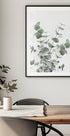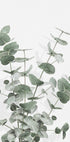 Una obra de arte botánica minimalista con hojas de eucalipto sobre un fondo blanco limpio. Las sombras suaves y los tonos naturales del verde crean una obra de arte mural fresca y relajante, perfecta para interiores modernos, diseño escandinavo o espacios inspirados en la naturaleza.