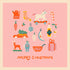 Una ilustración navideña rosa y nostálgica llena de pequeños y encantadores motivos navideños, como regalos, renos, bolas de Navidad, robots de juguete, tartas, vagones para árboles de Navidad y palitos. El estilo es retro y los colores son suaves y cálidos, y el texto "Feliz Navidad" está escrito en la parte inferior.