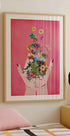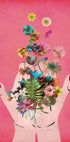 Una obra de arte vibrante y moderna que muestra manos liberando una explosión de flores y hojas de colores sobre un fondo rosa. El collage floral une naturaleza y creatividad y simboliza crecimiento, renovación y belleza. Perfecto para interiores modernos con un toque de encanto botánico.