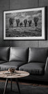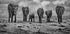 Una austera fotografía de vida silvestre en blanco y negro de una manada de elefantes deambulando por la sabana africana. La imagen captura fuerza y ternura y simboliza la familia, la protección y la unidad en la naturaleza.