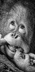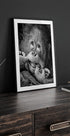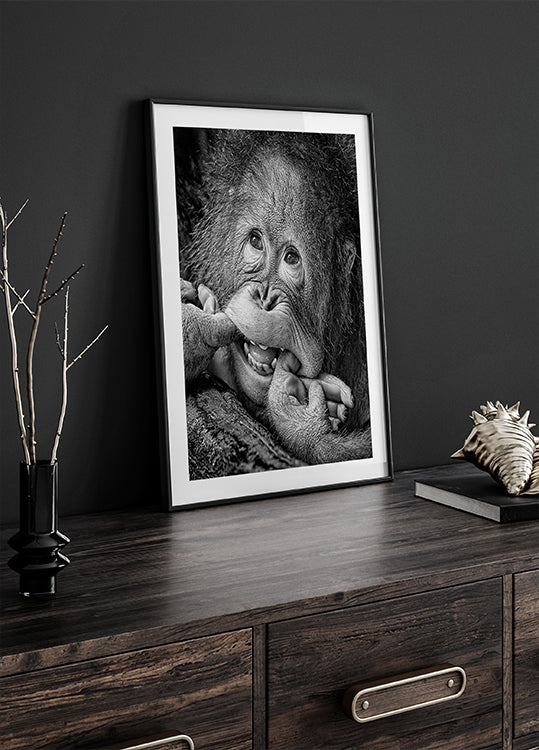 Un retrato en blanco y negro divertido y conmovedor de un joven primate con una expresión juguetona. La imagen captura alegría, inocencia y una sonrisa descarada, añadiendo calidez y humor a cualquier pared.