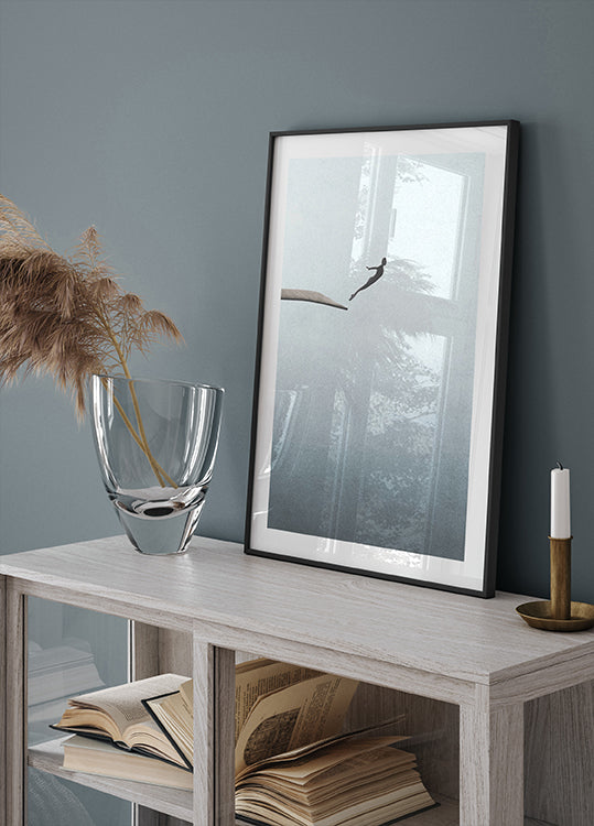 Una obra de arte limpia y simbólica que presenta una figura saltando desde un precipicio hacia lo desconocido. El póster captura un momento de confianza, valentía y entrega, ideal para espacios de contemplación y reflexión.