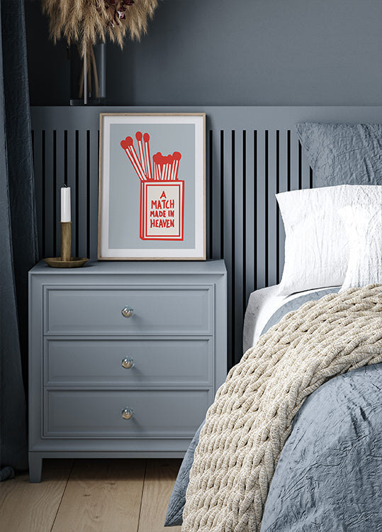 Heavenly Matches af Andreas Magnusson iscenesætter en vintage tændstikæske som et grafisk kærlighedssymbol: et stort rødt hjerte i midten, gnister der springer, og markant typografi i rød og blå. Popart-energi møder minimalistisk orden i et humoristisk, retroinspireret motiv, der fanger blikket. Og smiler.