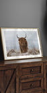Un majestuoso Highlander escocés se alza tranquilamente en un paisaje nevado, con su largo pelaje marrón espolvoreado de escarcha y sus cuernos en arcos gráficos contra el horizonte blanco. La paleta apagada del invierno y el frío brumoso crean calma nórdica y poesía rural. La fotografía es de Jaap van den Helm. Grabado en Veluwezoom, Países Bajos, e ideal para una decoración rústica y nórdica.