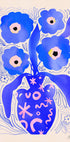 Un homenaje audaz y divertido a Matisse, con un animado jarrón lleno de llamativas flores azules sobre un fondo claro. El diseño combina patrones gráficos con elementos florales y crea una naturaleza muerta vivaz y moderna, ideal para interiores contemporáneos.