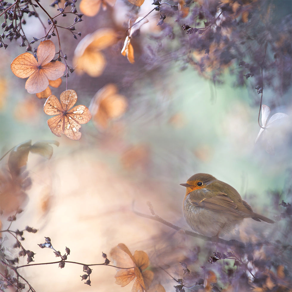 Hydrangea Fantasy de Teuni representa a una pequeña pelirroja entre hortensias cubiertas de escarcha, bañada por un suave bokeh y una ligera nieve. Los colores pastel y la luz suave dan al motivo un aura soñadora y aventurera, donde la poesía de la naturaleza se encuentra con la magia tranquila del invierno e invita a la tranquilidad al interior. Un atractivo poético para las almas botánicas.