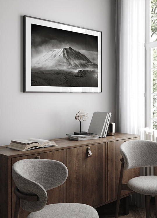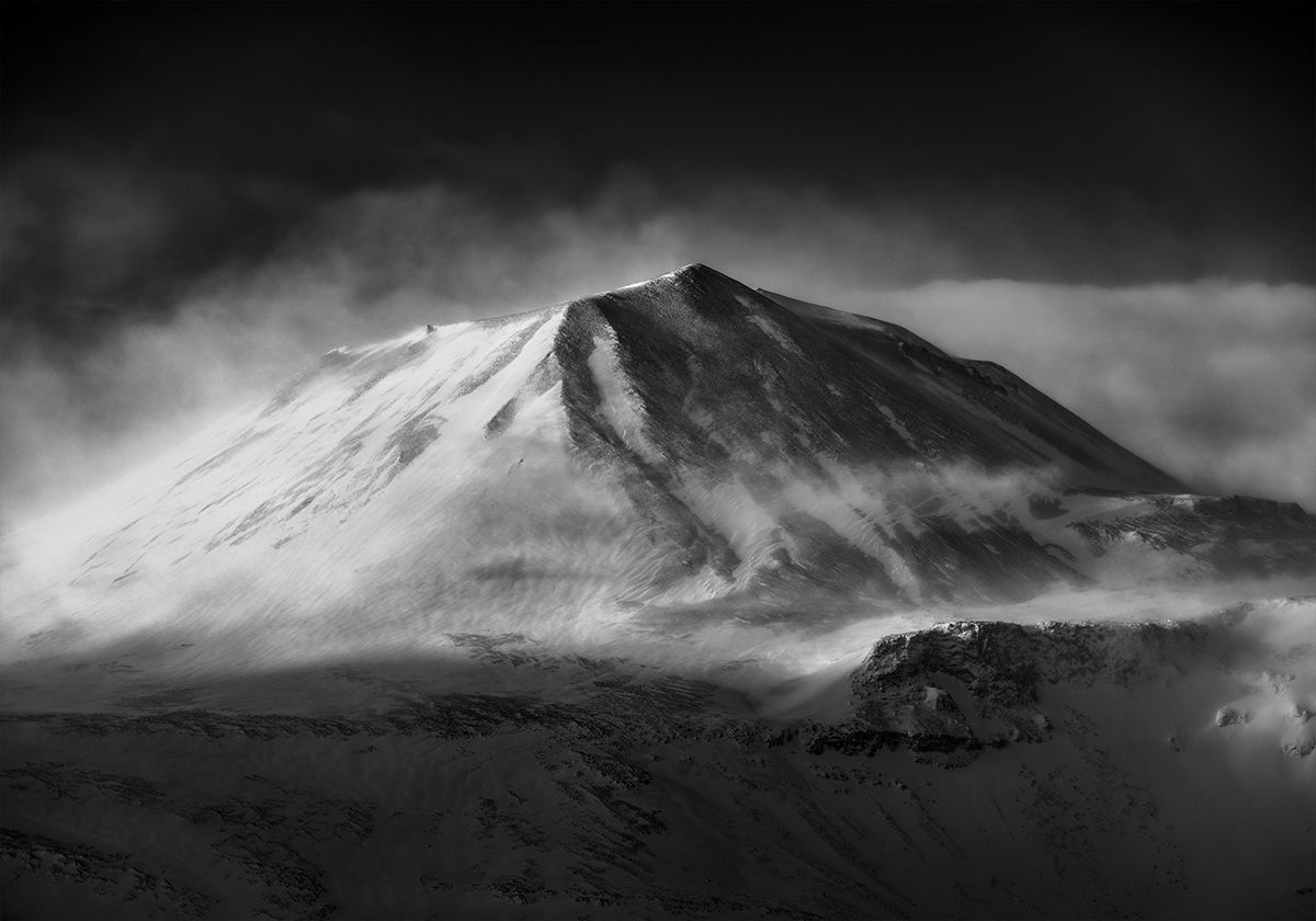 Una cresta cruda e invernal se eleva contra un cielo pálido; Los tonos azul hielo y las sombras profundas enfatizan la naturaleza implacable. Las nieblas flotan a lo largo de las laderas empinadas y dan al sujeto una calma misteriosa. Prohibido de Robert Bolton captura la belleza del frío e invita a una reflexión tranquila. Un motivo fuerte y minimalista para el hogar.