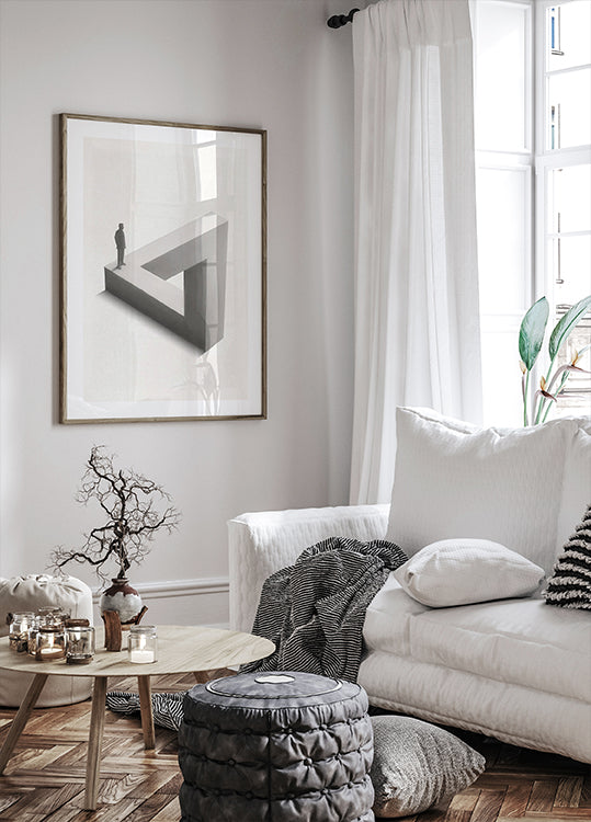 Un póster conceptual que presenta a un hombre sobre un triángulo de Penrose, un objeto imposible que representa la paradoja y la percepción. Su composición sencilla y su motivo sugerente lo hacen ideal para el arte mural moderno y filosófico.