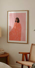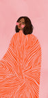 Una mujer envuelta en una capa fluida y con un estampado de color naranja vibrante sobre un fondo rosa suave. Esta ilustración contemporánea captura calidez y estilo con una expresión minimalista y abstracta, perfecta para los amantes del arte contemporáneo que buscan inspiración.