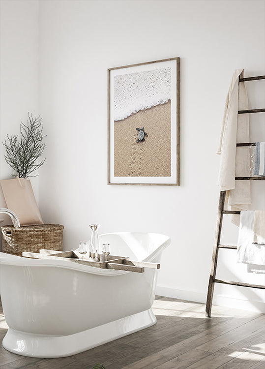 Una fotografía inspiradora que capta el momento en el que una pequeña tortuga llega al borde del mar. Pequeñas huellas conducen hasta la tortuga a medida que se acerca la suave espuma del mar. La imagen simboliza el inicio de un viaje extraordinario y es ideal para los amantes de la naturaleza o aquellos que desean un arte inspirador que celebre el coraje y la aventura.