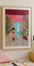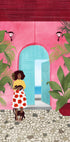 Una colorida ilustración inspirada en el encanto animado de Cartagena. Una mujer con una falda floral se encuentra junto a una puerta turquesa rodeada de exuberantes plantas tropicales, mientras juguetones gatos negros se relajan a su alrededor. La fachada rosa, la vista al mar y los detalles animados evocan la calidez y el ambiente veraniego de la costa caribeña.