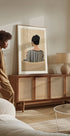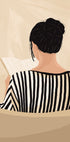 Una ilustración cálida y acogedora de una mujer leyendo desde atrás con un top a rayas. Los suaves tonos beige y el ambiente relajado crean una estética relajante, lo que la convierte en la pieza perfecta para dormitorios, salas de estar o rincones de lectura, ideal para cualquiera que ame los momentos tranquilos y los espacios acogedores.